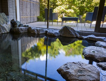 ラジウム温泉の大浴場に加えて、男女共用で入れる岩盤浴フロアもあります。岩盤浴のみでの利用はできないので、温泉のオプションとして利用します。温泉の後に入って更なる発汗とデトックスを図ったり、ホテルに到着後に岩盤浴に入ってじんわりと汗をかき、その後足湯に入ったりなどの利用もおすすめです。大浴場内にはサウナもあり。広い大浴場では庭園を眺めながら、高濃度のラジウム温泉を堪能できます。