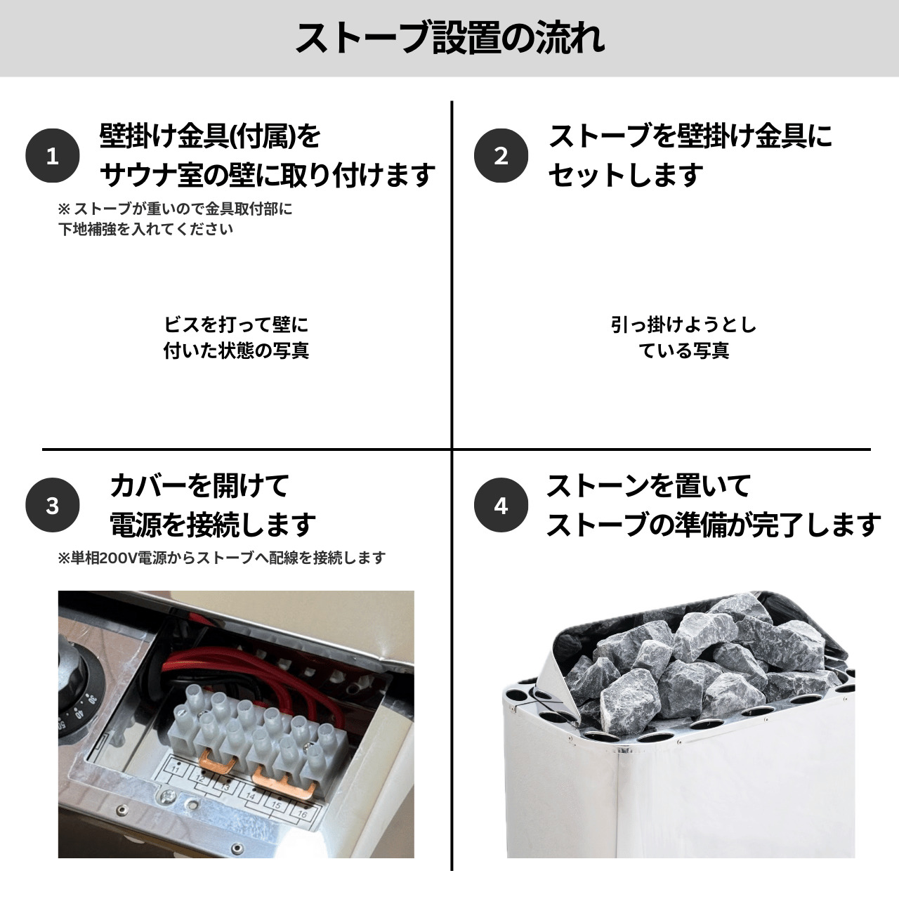 設置は壁掛け金具の固定、本体の設置、単相200V電源の接続、サウナストーンのセットの最短4ステップで完了し、複雑な組み立てを必要としません。