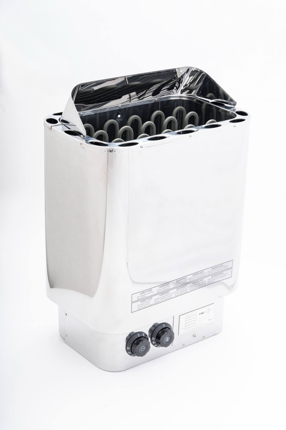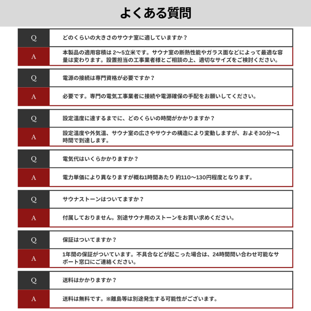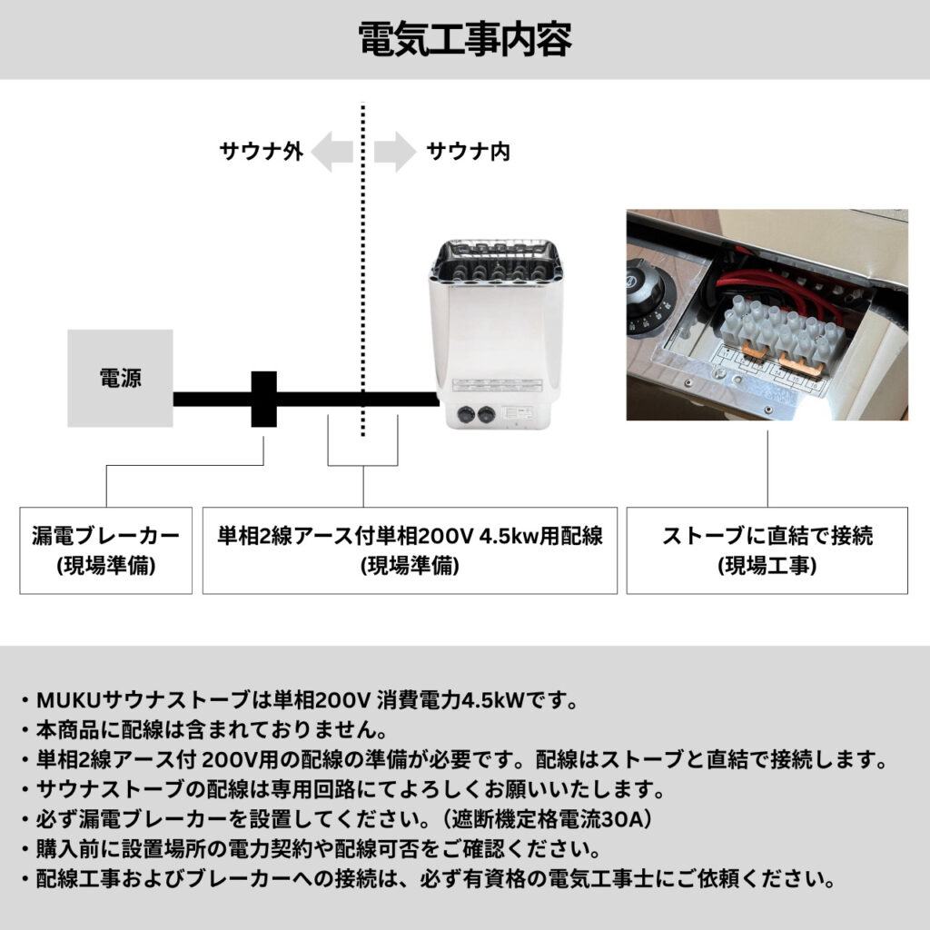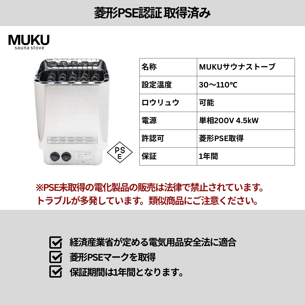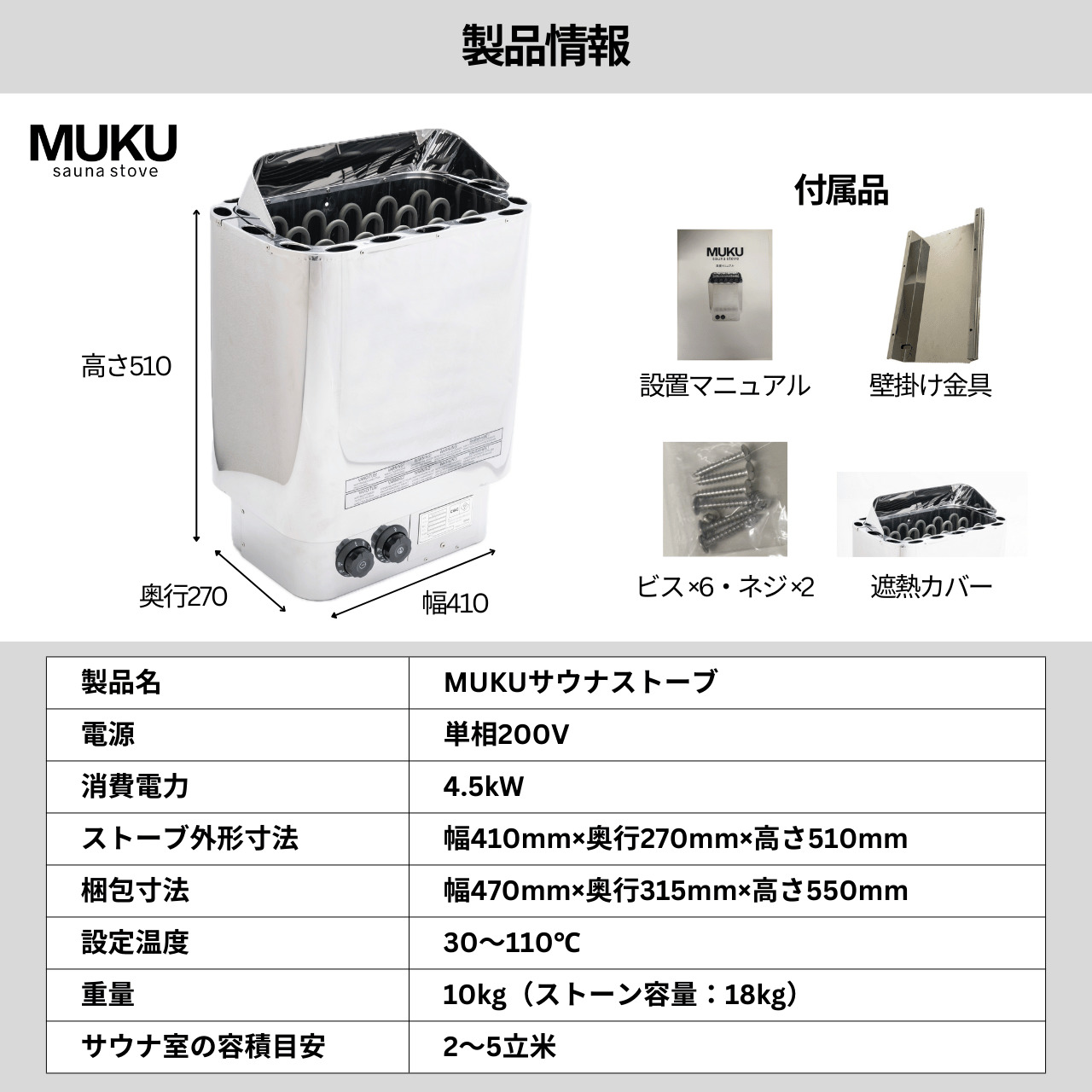 MUKUサウナストーブは、電源に単相200V・4.5kWを採用し、サウナ室容積2〜5立米を目安に対応する電気サウナストーブです。